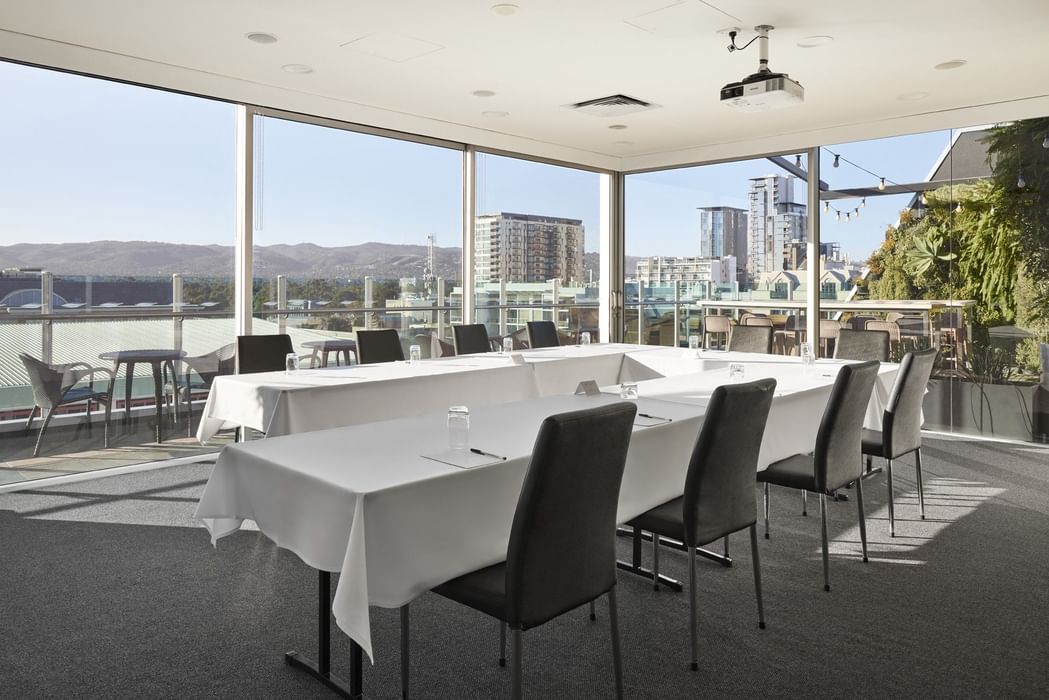 Floor-to-ceiling sliding glass doors in Nandina East open out to our unique seventh floor roof garden providing spectacular panoramic views of the Adelaide Hills and East End city streets.